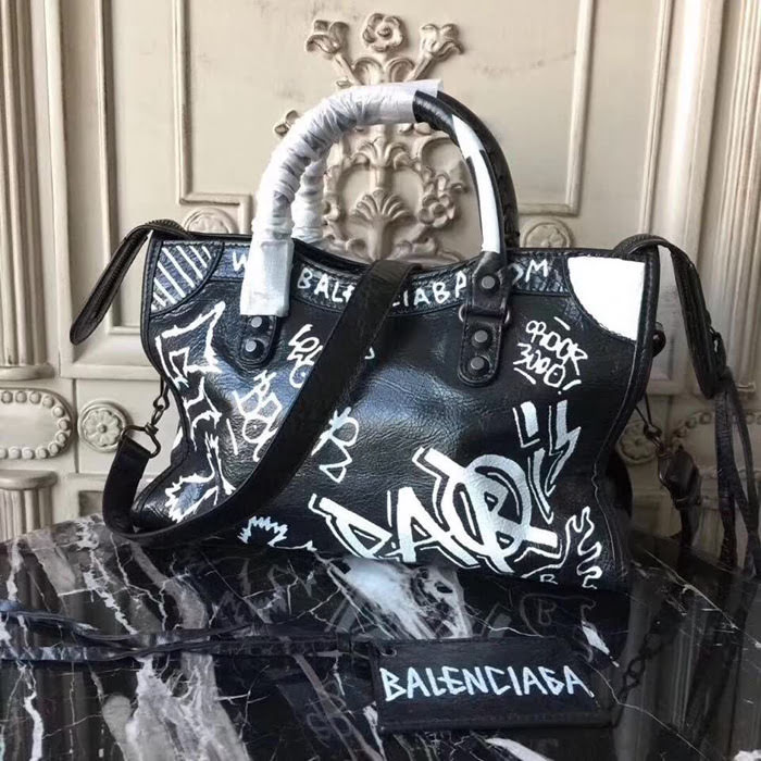 BALENCIAG巴黎世家 Graffiti Classic City30cm機車包 義大利爆裂紋羊皮 手繪彩色塗鴉 手提肩背斜挎包  BL1464