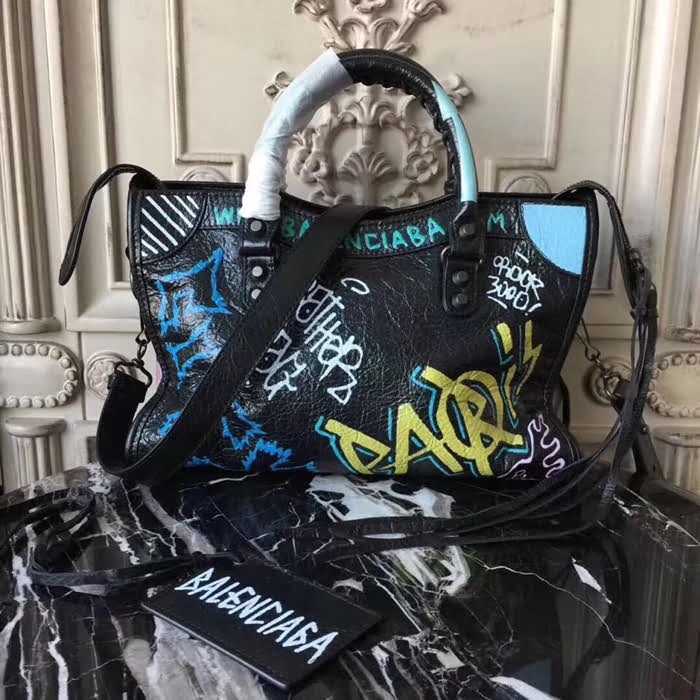 BALENCIAG巴黎世家 Graffiti Classic City30cm機車包 義大利爆裂紋羊皮 手繪彩色塗鴉 手提肩背斜挎包  BL1466