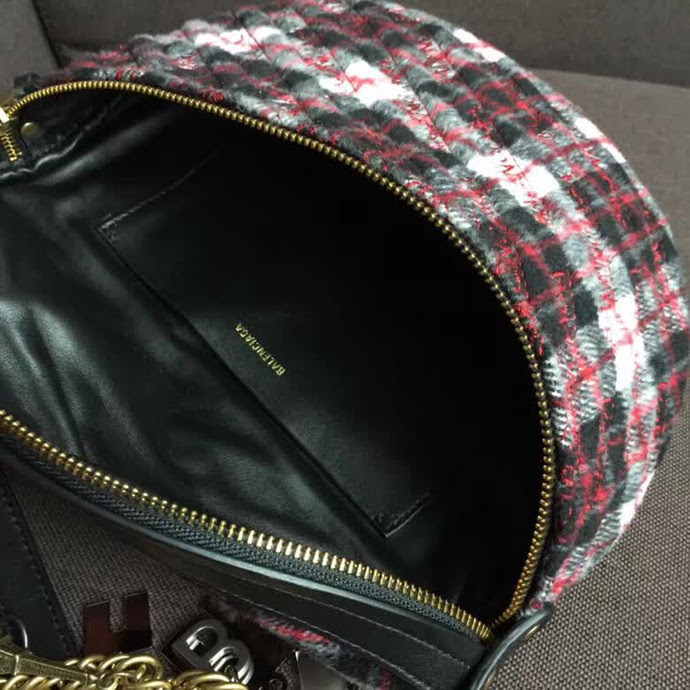 Balenciag 半月腰包 採用進口絨布材質 滿飾Balenciaga標識提花 搭配紀念品吊飾 正面拉鏈口袋 正面壓印金色Balenciaga品牌標識 可調節腰帶 size27*8*18