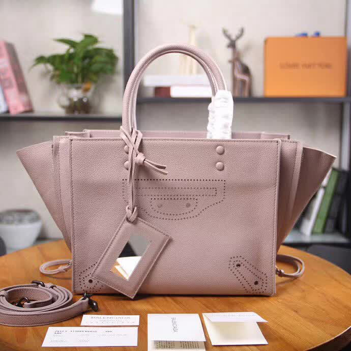 Balenciaga手提挎包 大貨號7065950860(33*26*16cm,展開57cm) 小貨號7060950820(25*20*11cm,展開32cm) 巴黎世家18年最新款包包,正品開模,細節到位,簡約的設計,精緻的鏤空點點圖騰做裝飾,兩側可展開收納,展開時呈現出蝙蝠形狀,如此設計使包包秀出時尚與大氣感,大身採用摔紋牛皮連帶內裏,精緻的小件五金打造,做工更是不用多說,上身真是美極了。