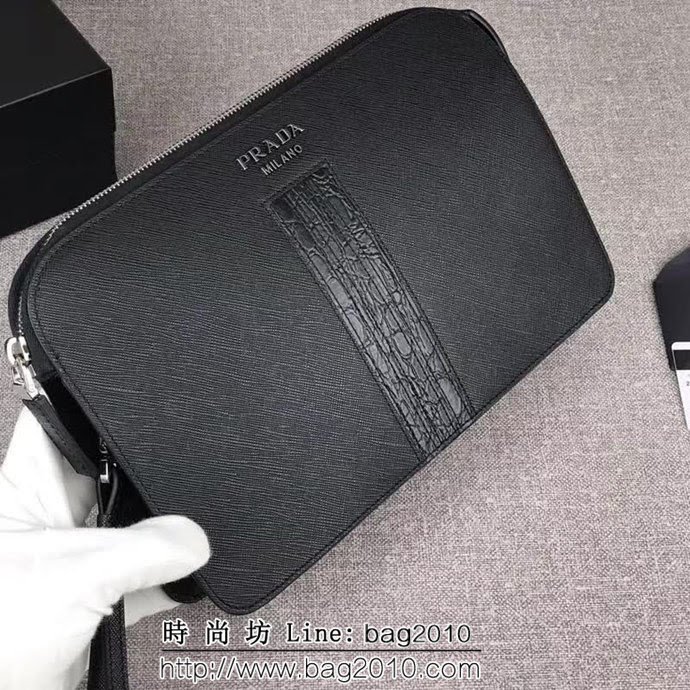 【原單代購級】PRADA男士手包 專櫃最新款式,官網同步,正品開發,型號2VF056,顏色:黑色+黑色/彩帶鱷魚皮,內碼布標165代工碼 義大利頂級原單十字紋牛皮質感極好,內裏進口專用布配納帕牛皮 原廠進口槍色字嘜、白鋼五金配件!精湛走線均勻整齊 純手工油邊平滑,做工精湛 如圖可見,彩帶鱷魚皮更顯高檔,設計獨特新穎 尺寸:長26.5cm高17cm寬5cm【配原單包裝盒身份證卡片編號可掃碼】