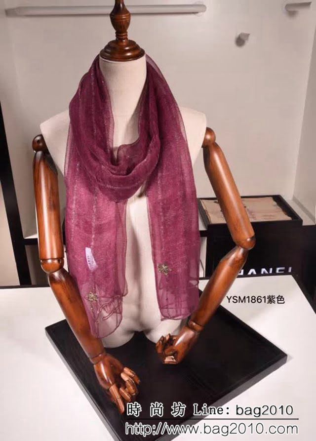 CHANEL香奈兒 2018秋冬專櫃刺繡真絲羊毛長圍巾 YSM1861 LLWJ6166