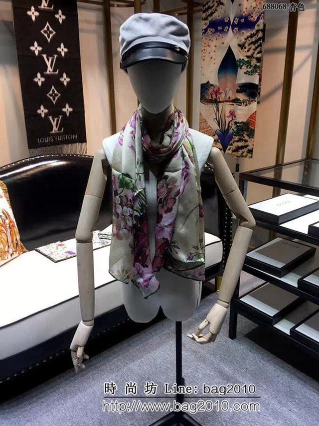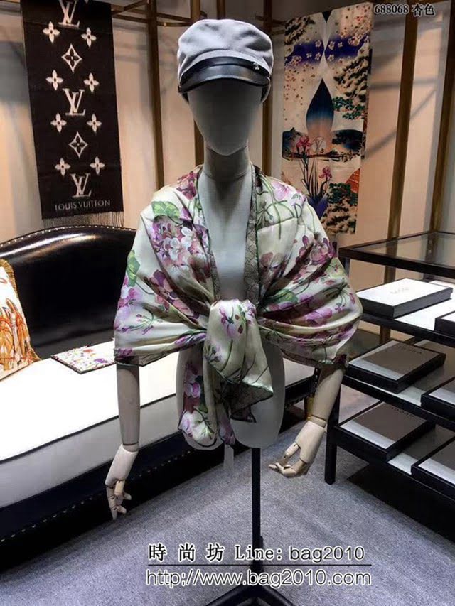 工廠漲價,早買早便宜,古馳這款圍巾真的很經典 全手工邊絕對不含糊 Gucci天竺葵雙層雙面印花絲巾蠶絲 真絲手工卷邊長巾圍巾 材質百分百真絲 【尺寸60cmX170cm】【688068】