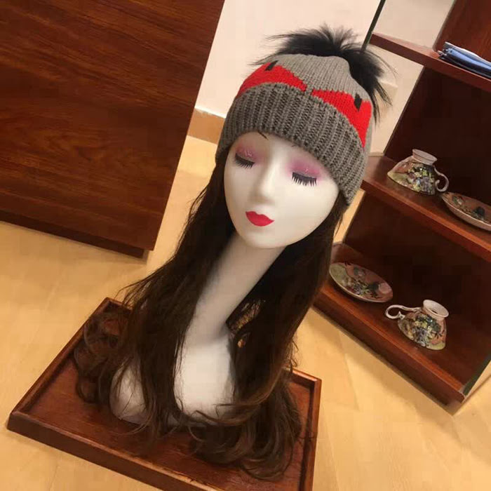FENDI芬迪 秋冬新款 原單小怪獸 羊毛線配狐狸毛球針織帽 LLWJ7442