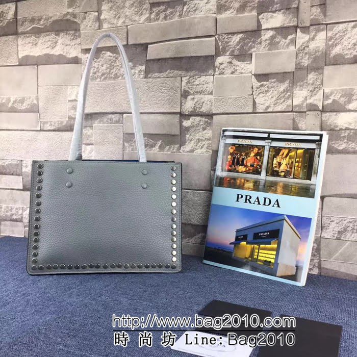 最新爆款2018年最新款 Prada Etiquette 1BD121 手提購物袋 明星同款 最新款皮手柄 採用義大利進口小牛皮(自然摔)錫鉛色金屬配件 金屬釘飾邊 磁扣開合 對比色皮革標識 一個拉鏈中袋和兩個內袋/超級實用 時尚洋氣 無敵美美噠!女神必備尺寸W28xH20.5x14.5cm