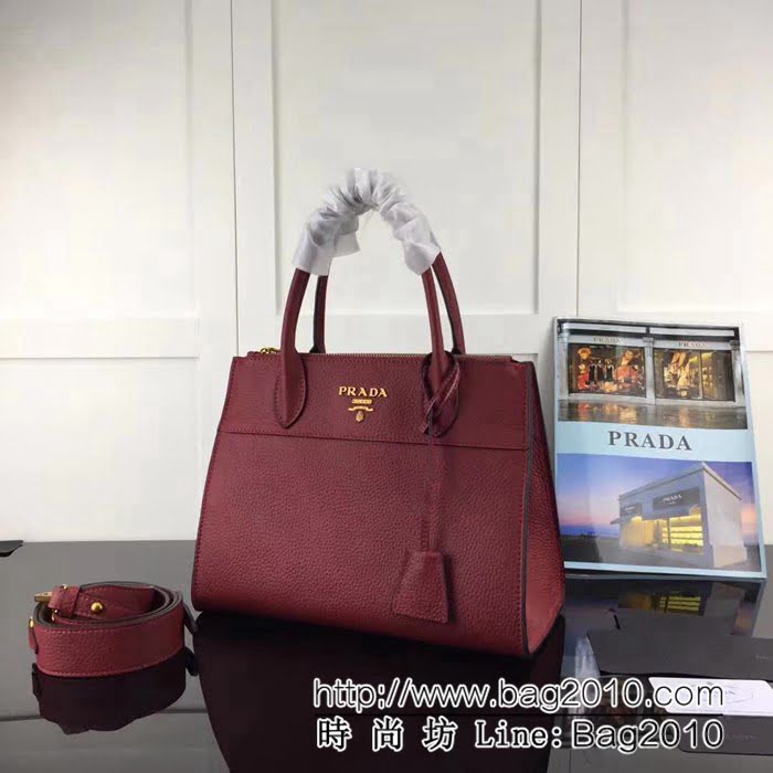 PRADA 專櫃新款Esplanade Saffiano手袋 1BA102-2E原單進口頭層荔枝紋牛皮配古銅五金、做工精緻、光滑平整的邊油、質感柔軟、配寬版肩帶、可肩背兩用 克色、寶藍、棗紅、灰色、土黃、冰藍、6色上市/W30.5*H23.*D15cm/義大利產地標+175代碼
