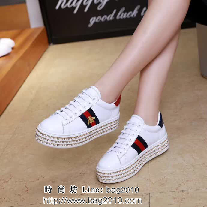 GUCCI古馳 新一季爆單款 厚底松糕小白鞋 小蜜蜂水鑽 QZS2386