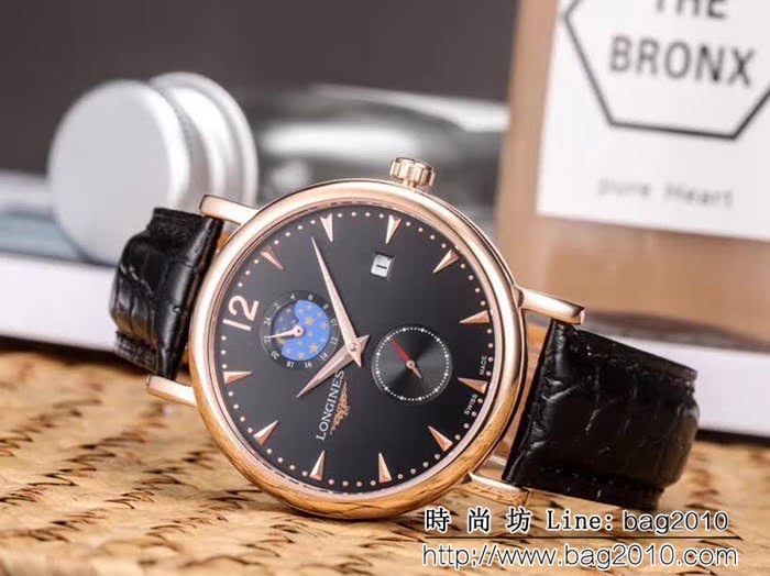 浪琴 Longines 精品男士腕表,四針分離搭載月相設計,技藝精湛,獨具匠心,尊貴大氣,紳士風範。採用全自動機械機芯,頂級316精鋼表殼,進口小牛皮錶帶,礦物質超強鏡面,尺寸40*12