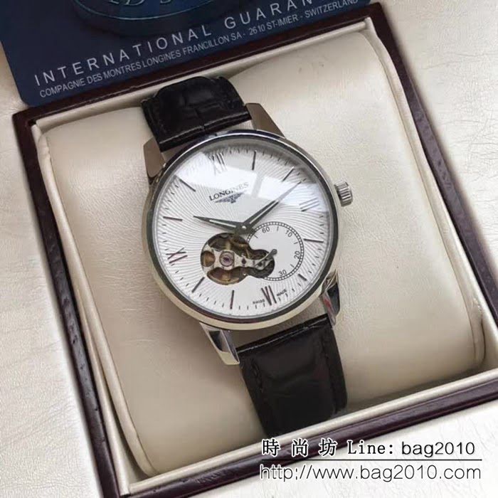 品牌:浪琴新款獨家首發簡約時尚別致飛輪 類型:精品男士腕表 錶帶:真牛皮錶帶 機芯:頂級全自動機械機芯 鏡面:礦物質強化玻璃 品味高雅 浩瀚大氣 匠心獨運 腕間瑰寶 尺寸:直徑41m厚12mm熱賣上市!高清圖片 實物拍攝無色差實物更精緻