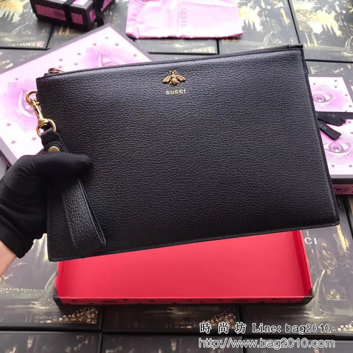 GUCCI古馳 歐洲正品原單 新款 黃銅色小蜜蜂手拿包 523684 黑全皮 WTG1546