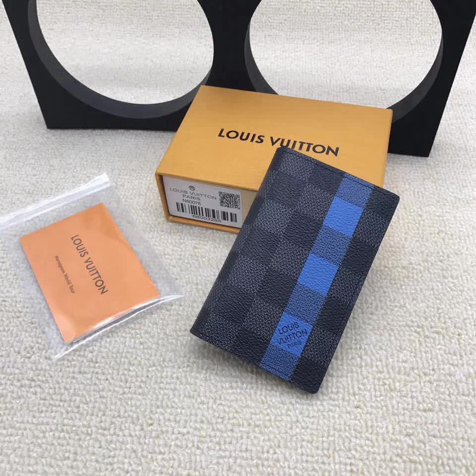 N60076頂級原單此款路易威登口袋錢夾身材小巧,功能強大,可存放信用卡紙幣與票據,明快的藍色使DamierGraphite帆布顯得亮麗活潑,7.5x11.0cm (長x高)