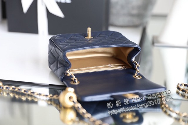 Chanel專櫃秋冬新色金球包方胖子深藍色羊皮口蓋包 香奈兒菱格紋小金球cf鏈條女包 djc5274
