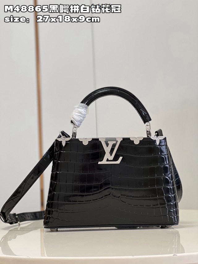 LV專櫃2023新款鱷魚紋手提肩背女包 M48865黑鱷拼白鑽花冠 路易威登Capucines BB手袋 dn1174