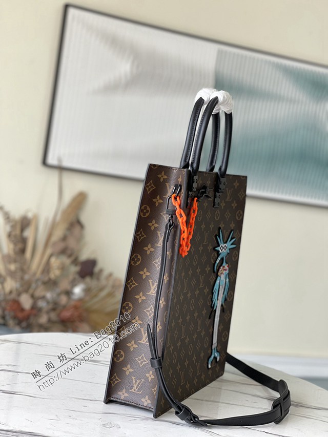 頂級原單 M45667 Sac Plat 郵差包以 Monogram 帆布和啞光皮革飾邊塑造纖薄構型,並邀請 Virgil Abloh 為 2021 春夏男士時裝秀創作的小夥伴化身卡通形象印花。尺寸:36 x 36 x 9 釐米