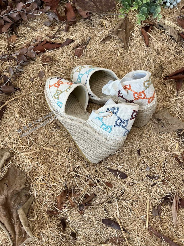 22ss早春Gucci古奇草編漁夫鞋厚底坡跟涼鞋能夠為你的夏日裝扮帶來一抹摩登風情。鞋面:多色GG亞麻帆布襯裏:皮革鞋底:橡膠鞋底露趾圓頭西班牙製作符合正常尺碼略寬國際標準尺碼防水臺10cm碼數:35-41顏色:彩虹色