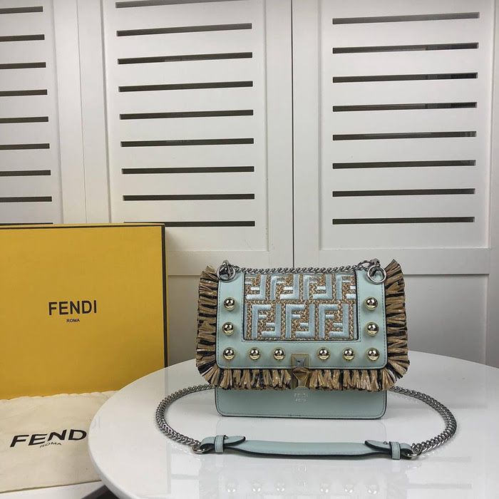 咱家新款 再次 啦最新款 KAN I手袋,FENDI F LOGO,時尚獨特,設計磁扣開合,內部接襠設計,設有一個口袋,皮配鏈子肩帶,可斜背或手拿,翻蓋飾以拼色刺繡字母以及編織邊邊,鍍鈀飾面混搭金色飾面金屬配飾亮點,尺寸:19x9x14cm 流水號280888