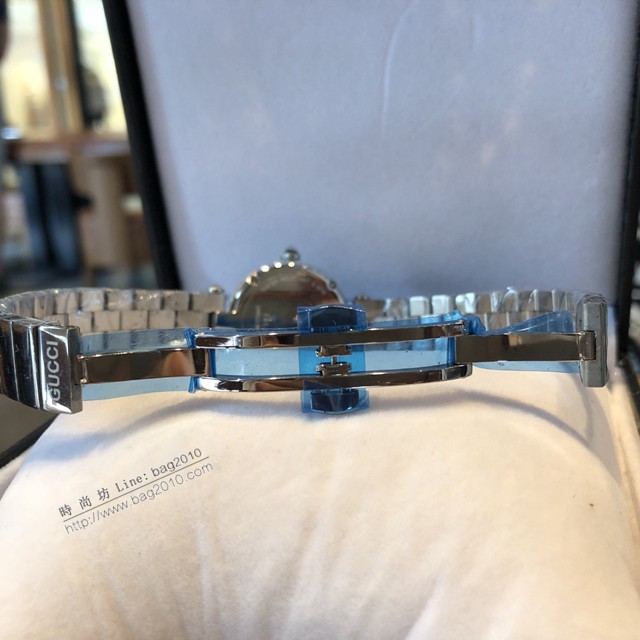 Gucci經典巴塞爾款,中號27mm表徑,鋼質感表面,三十米生活防水,瑞士機芯,蘭寶石玻璃,側邊原廠鏤空雕花菱格紋設計.鑲嵌雙排鑽,超強視覺衝擊。