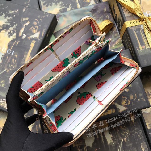Gucci包 古馳馬銜扣錢包 570661草莓全皮 2019新款 印花草莓拉鏈包拉鏈長款女錢包  gudj1037