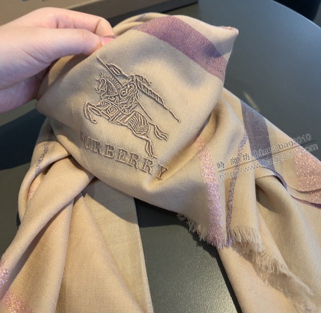 Burberry·巴寶莉新品經典巴格輕盈羊絨圍巾經典戰馬刺繡logo搭配小格紋,熠熠生輝的銀絲線條炒雞簡約款,福利來啦,貨源超正分直接出口.紗線都是專櫃定制義大利紗線.因為交貨延期,導致一部分滯留.100%羊絨300支.手感超級軟糯.輕薄透氣,適合一整年.尺寸:80*200cm.極品本身,愛到爆炸.收了收了