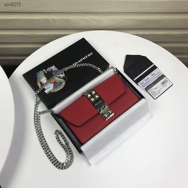 【原單代購級】Prada最新春夏款柳釘按鎖、可拆卸鏈條肩帶、可當手包可單肩背,什麼場合都可以用,拿著它,在哪里都是最受人矚目,時尚達人怎麼可以錯過呢專櫃同步,正品開發,型號1ZH061,顏色:紅色,內碼224代工碼 義大利頂級原單進口小牛皮質感極好,進口環保油邊 進口白鋼五金配件!精湛走線均勻整齊 ,做工精湛 品質媲美正品,尺寸:長19cm*高10cm