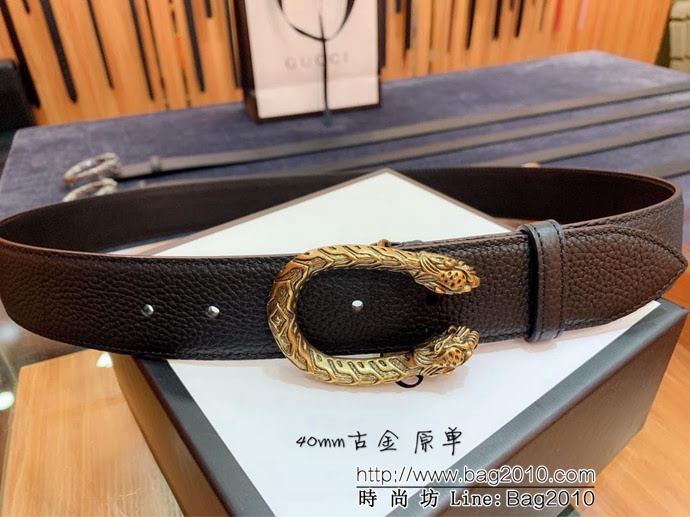 GUCCI古馳 官網新款 原單品質 自然荔枝紋 復古雙虎頭U字型酒神扣 男士皮帶 xfp1073