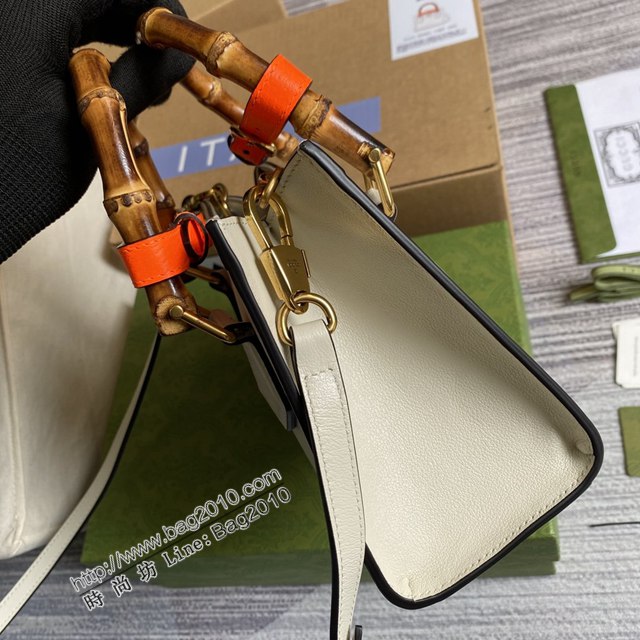 迷你托特包融合了竹節提手和雙G配件兩個具有辨識度的品牌元素。白色皮革材質與兩根霓虹色扣帶相映成趣,突顯靈動優雅的氣質。迷你尺寸:20*16*10cm型號:655661。
