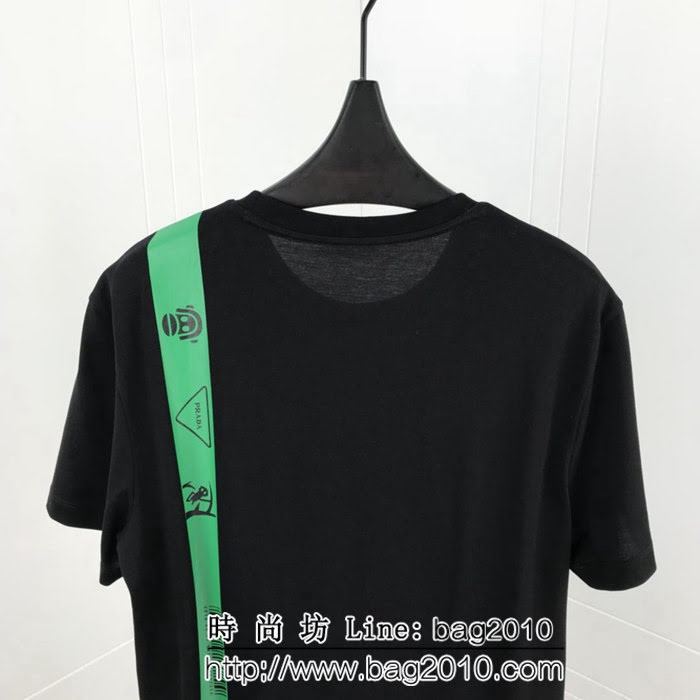 PRADA普拉達 19ss早春新款 絲光棉短袖 綠條印花拼接 簡約百搭款 高版本男女同款 ydi2158