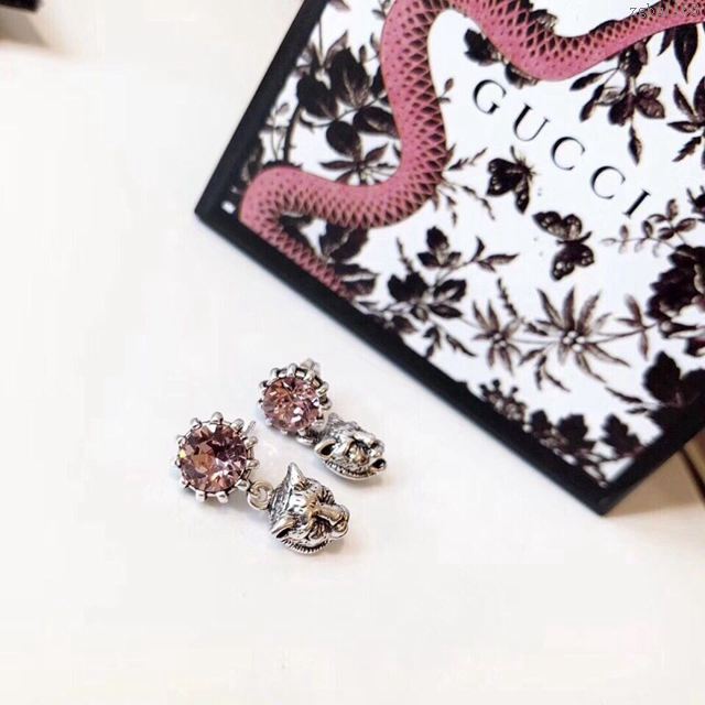 GUCCi飾品 黃銅材質搭配純銀針 古馳耳環吊環 Gucci粉鑽豹頭耳釘 zgbq1163